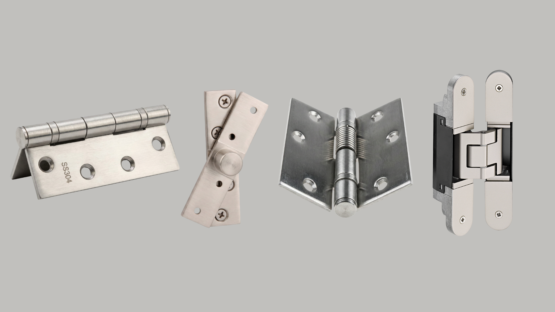 Four different types of stainless steel door hinges are displayed horizontally against a plain gray background