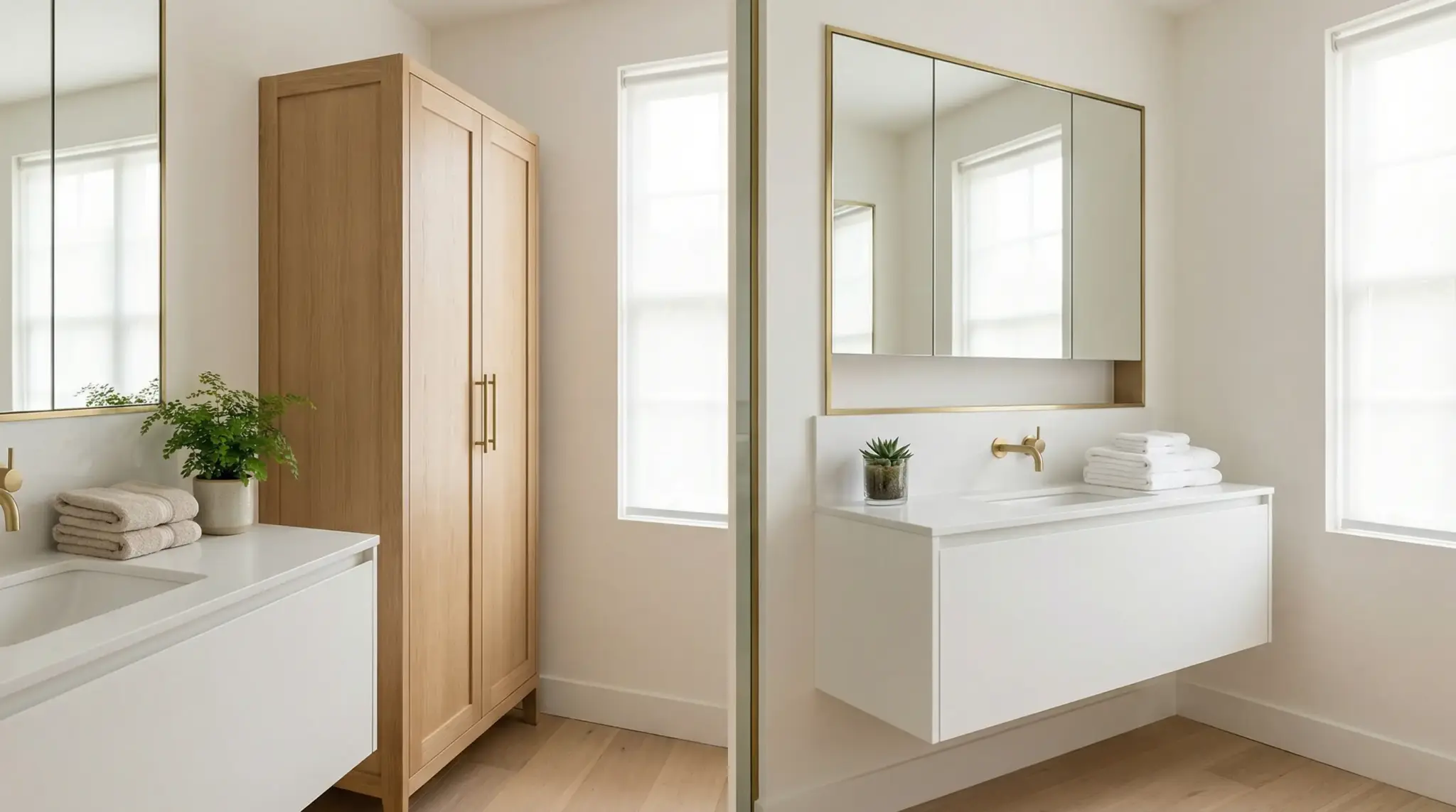 Minimalist bathroom with wooden cabinet, floating vanity, gold fixtures, and natural light through windows