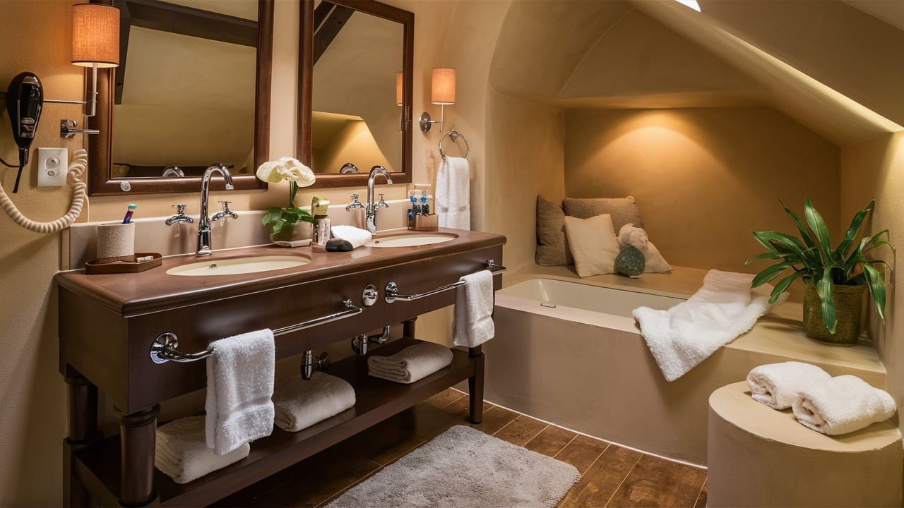 Add gold lights, crystal knobs, or even a small velvet stool for a rich touch. These small things make the bathroom feel special and cozy without being too much.
