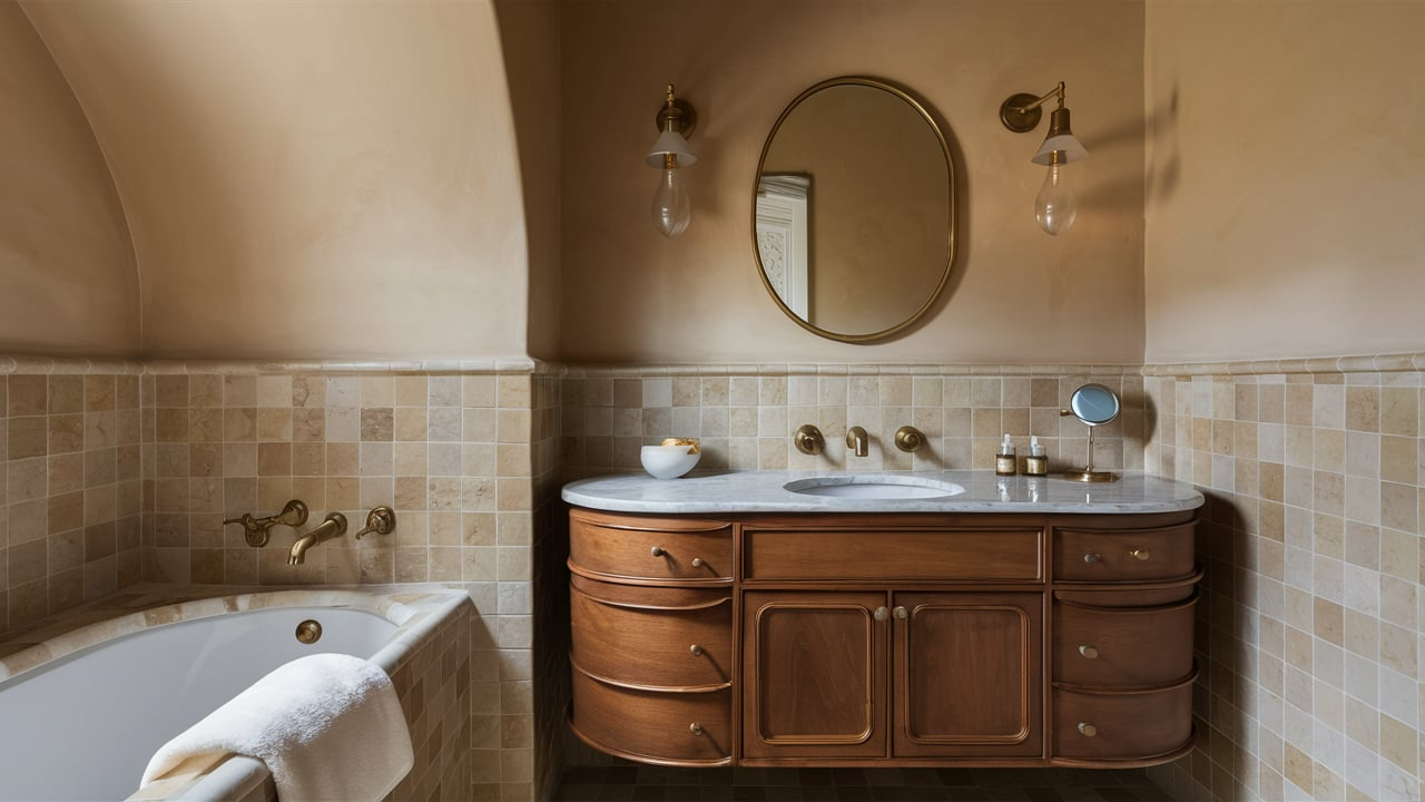 Brown wood or brass accents complete the look. This style feels like a cozy mix of old and new and adds personality to your bathroom.