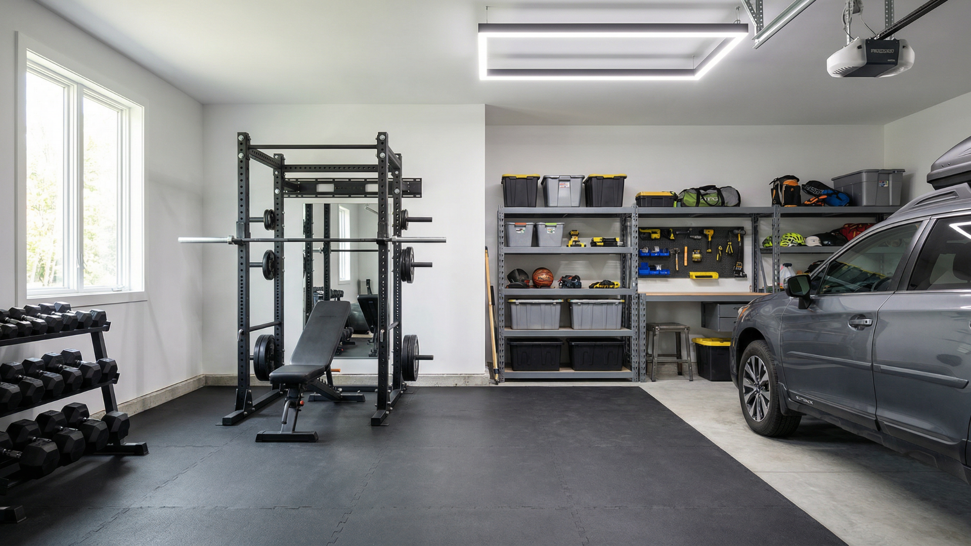 Storage Strategy: Install ceiling-mounted racks on the storage side for seasonal bins. Keep tools and household items strictly outside the gym boundary.