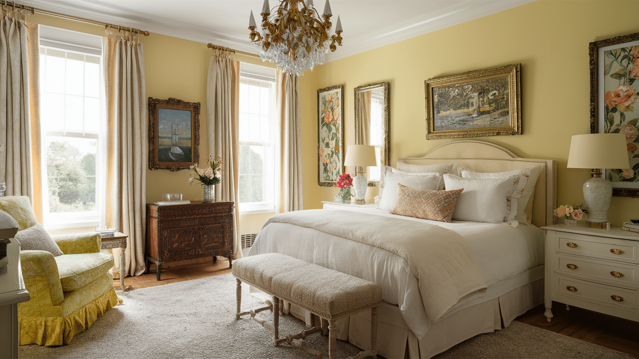 Soft yellow adds a sunny, cheerful vibe, and white keeps everything feeling clean and bright. This combo is great for traditional homes that want a light, happy look. It works well in kitchens, bathrooms, or guest rooms. You can also use yellow in floral fabrics or wall art to brighten the space even more.