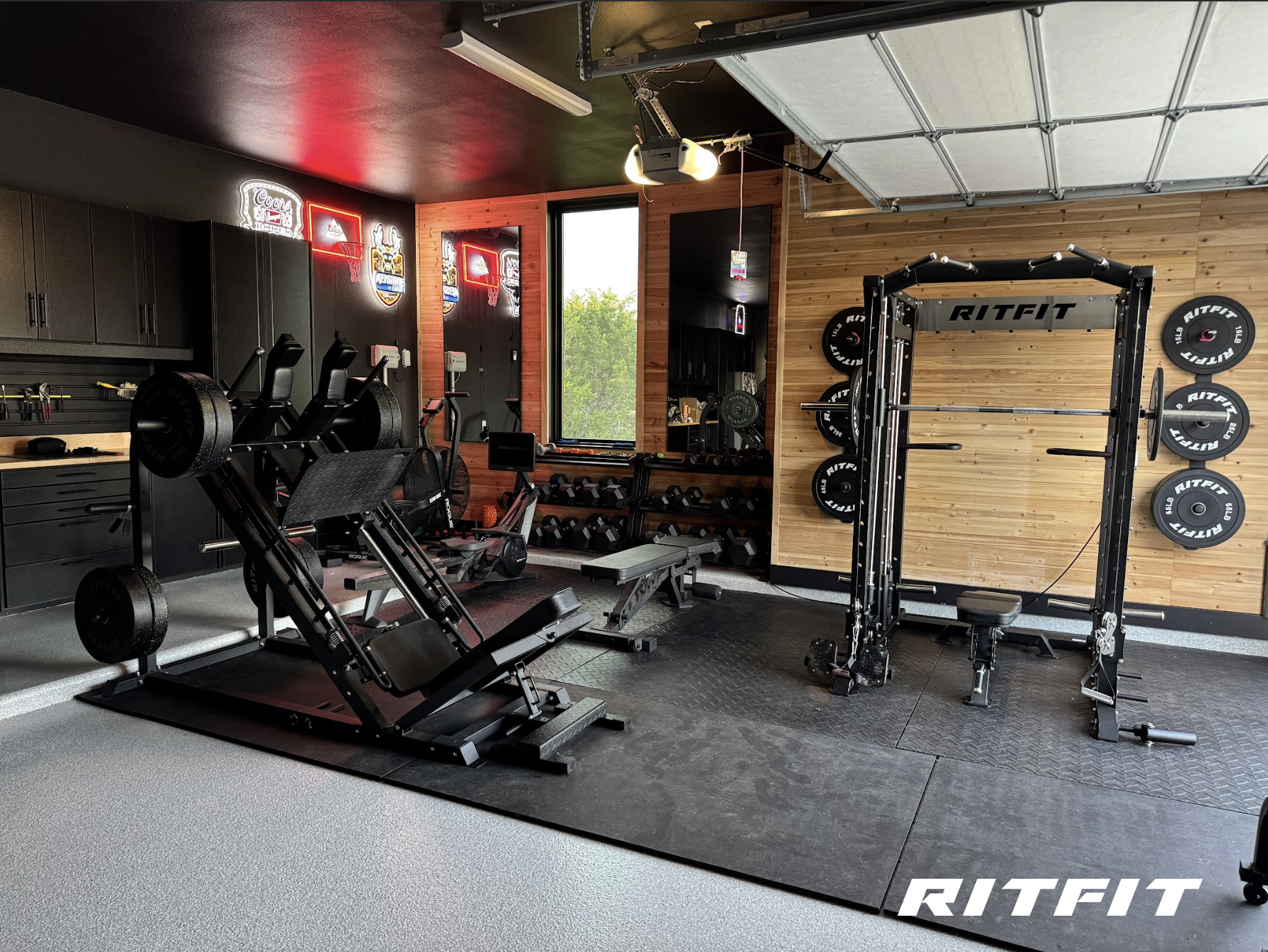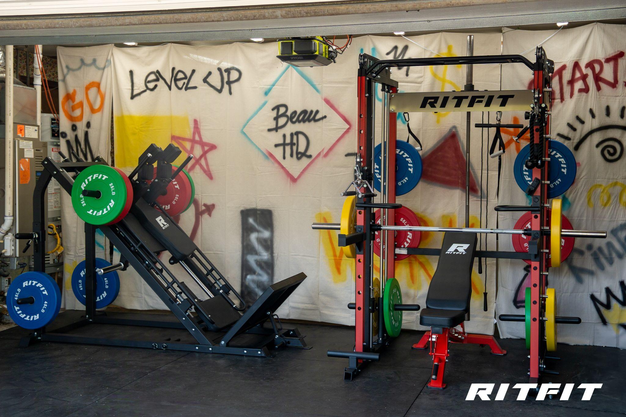 Install the RITFIT M1 Smith Machine against a plain wall as your functional anchor. Add colorful resistance bands, battle ropes, and bright kettlebells for urban flair. Finish with industrial lighting and black rubber flooring.