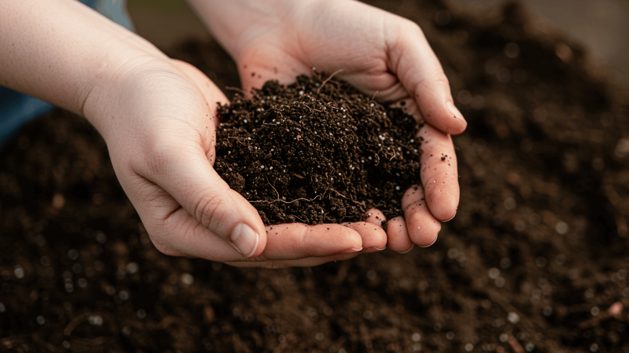 Cupped hands holding rich, dark potting soil with white perlite flecks against a blurred background of loose earth.
