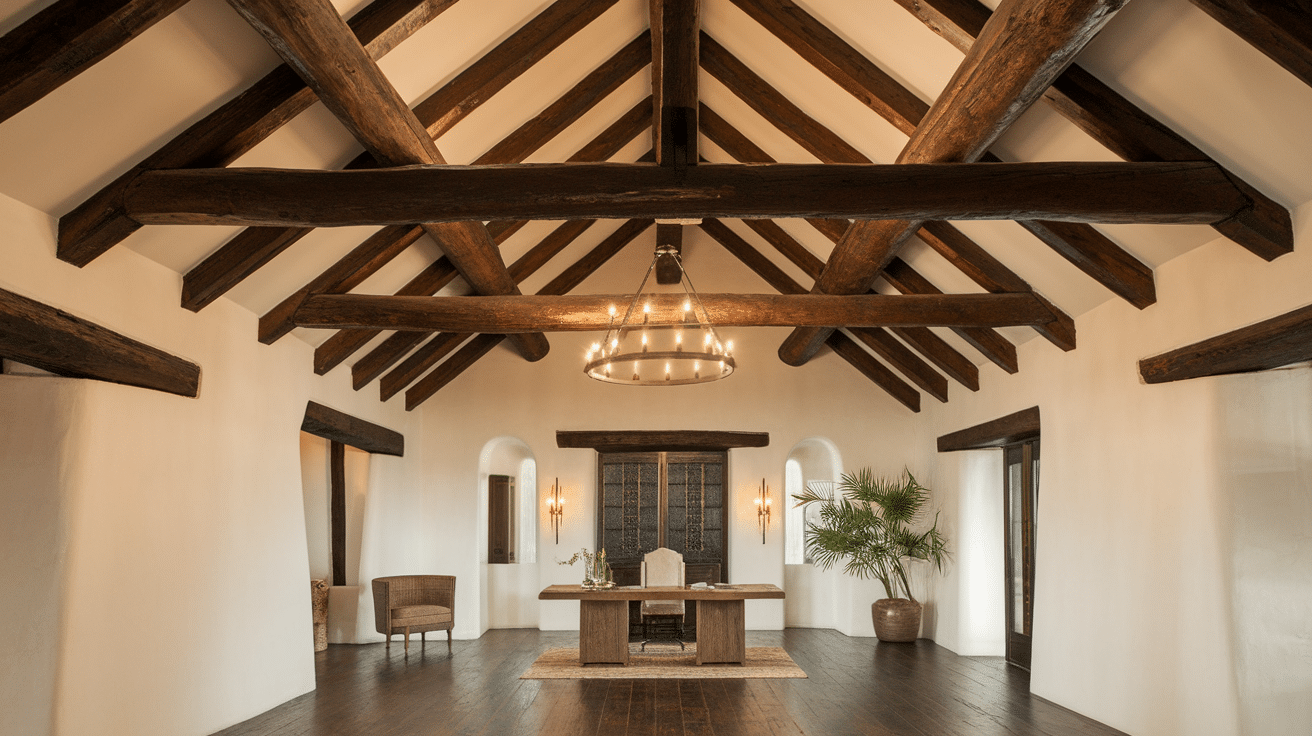 Hacienda homes often have high ceilings with large wooden beams. These beams are not just for looks—they also support the roof and give the room an open and strong feel.