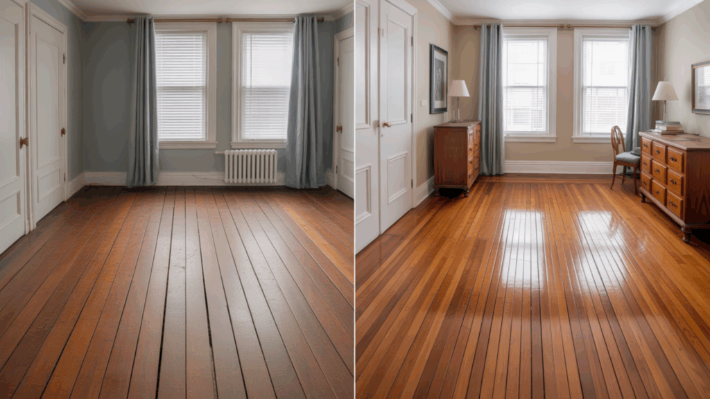 1. Condition of the Floor: Check for deep scratches, stains, water damage, or warped boards. If the damage is light, a quick polish might do the trick. If it’s more serious, sanding and refinishing may be needed.