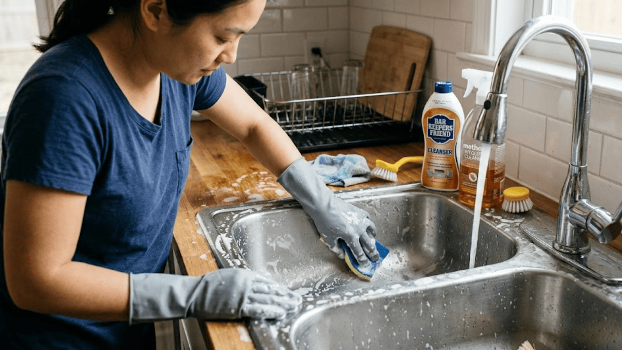 It cuts through rust, hard-water stains, and grease without scratching steel. Rinse the sink thoroughly after scrubbing to remove all the product.