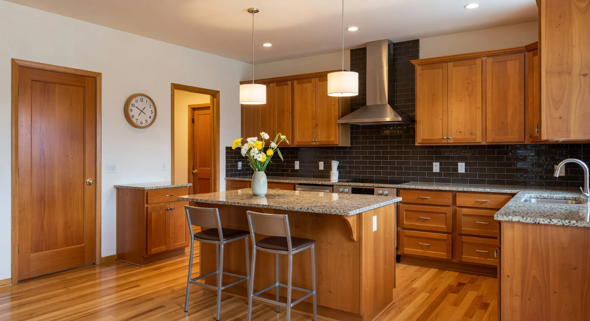 A Craftsman-style kitchen with wooden cabinets, a granite island, bar stools, and a vase of flowers