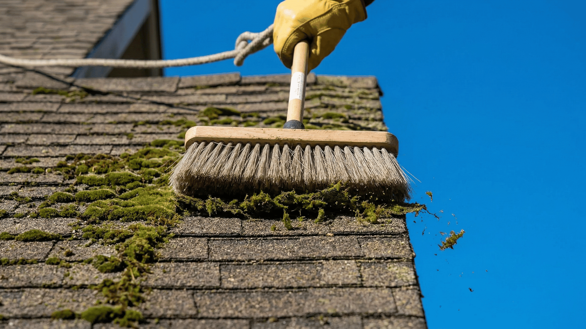 Moss often looks deeply rooted but usually loosens easily with steady, light strokes. Brush downward in the direction of the shingles to prevent lifting them.
