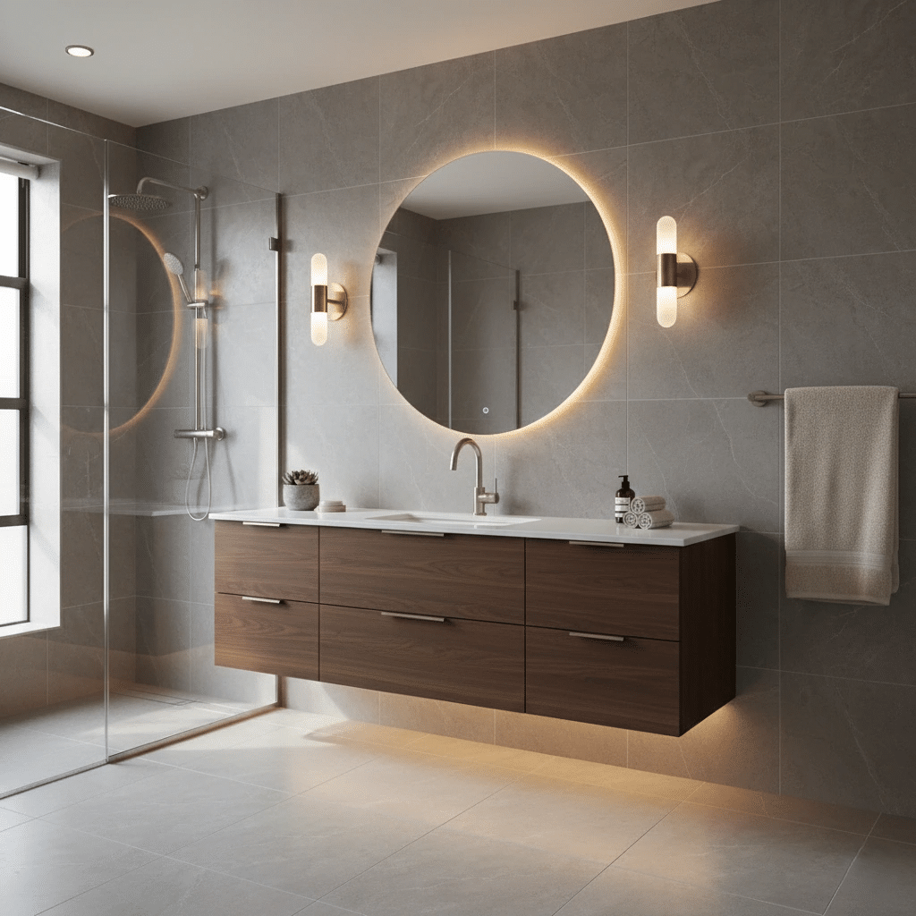Lighting is the number one reason designer bathrooms look so polished. A basic ceiling light creates flat, unflattering illumination, while layered lighting gives the space depth, warmth, and a professional feel.