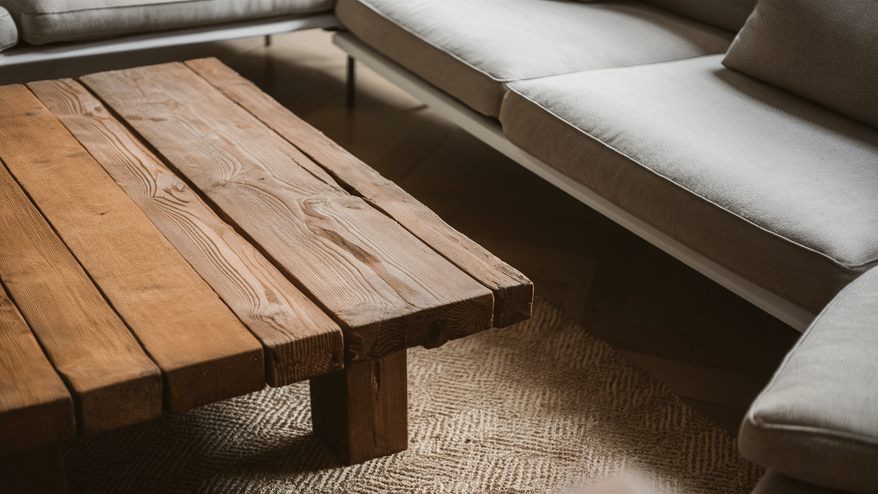 A weathered wood coffee table grounds modern seating areas. I pair vintage wooden tables with contemporary sofas and chairs. This mix creates a collected, thoughtful feeling that’s both Spanish and current.
