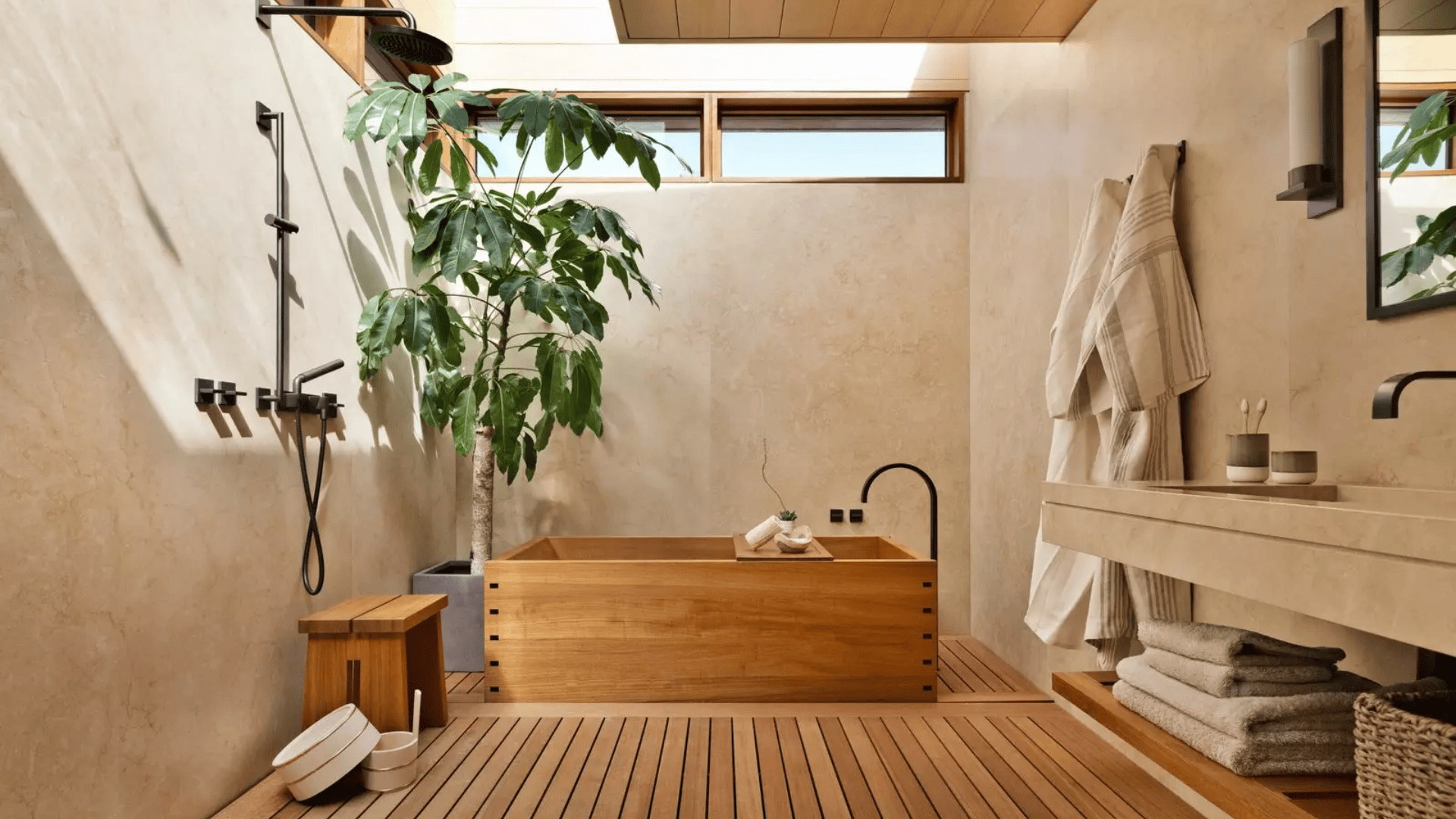 If possible, include a deep tub inspired by the traditional Japanese ofuro for quiet, relaxing baths.