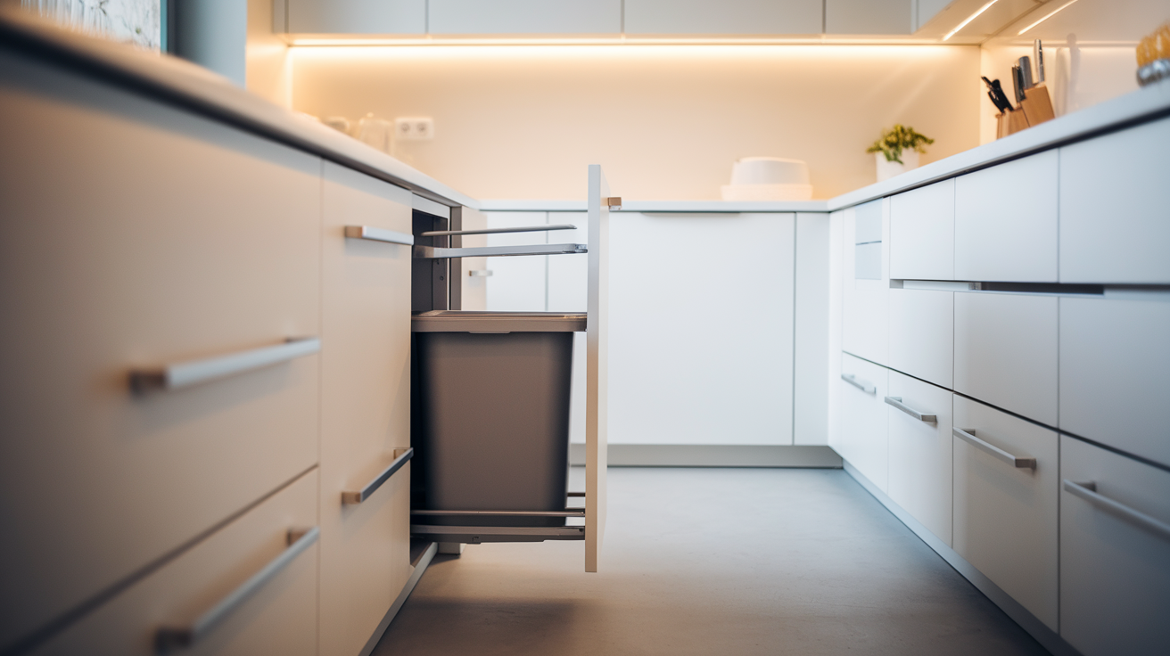 Before this upgrade, a trash can sitting out in the open can make the kitchen look cluttered and unclean. After installing a pull-out trash bin inside a cabinet, the room feels neater and more streamlined.