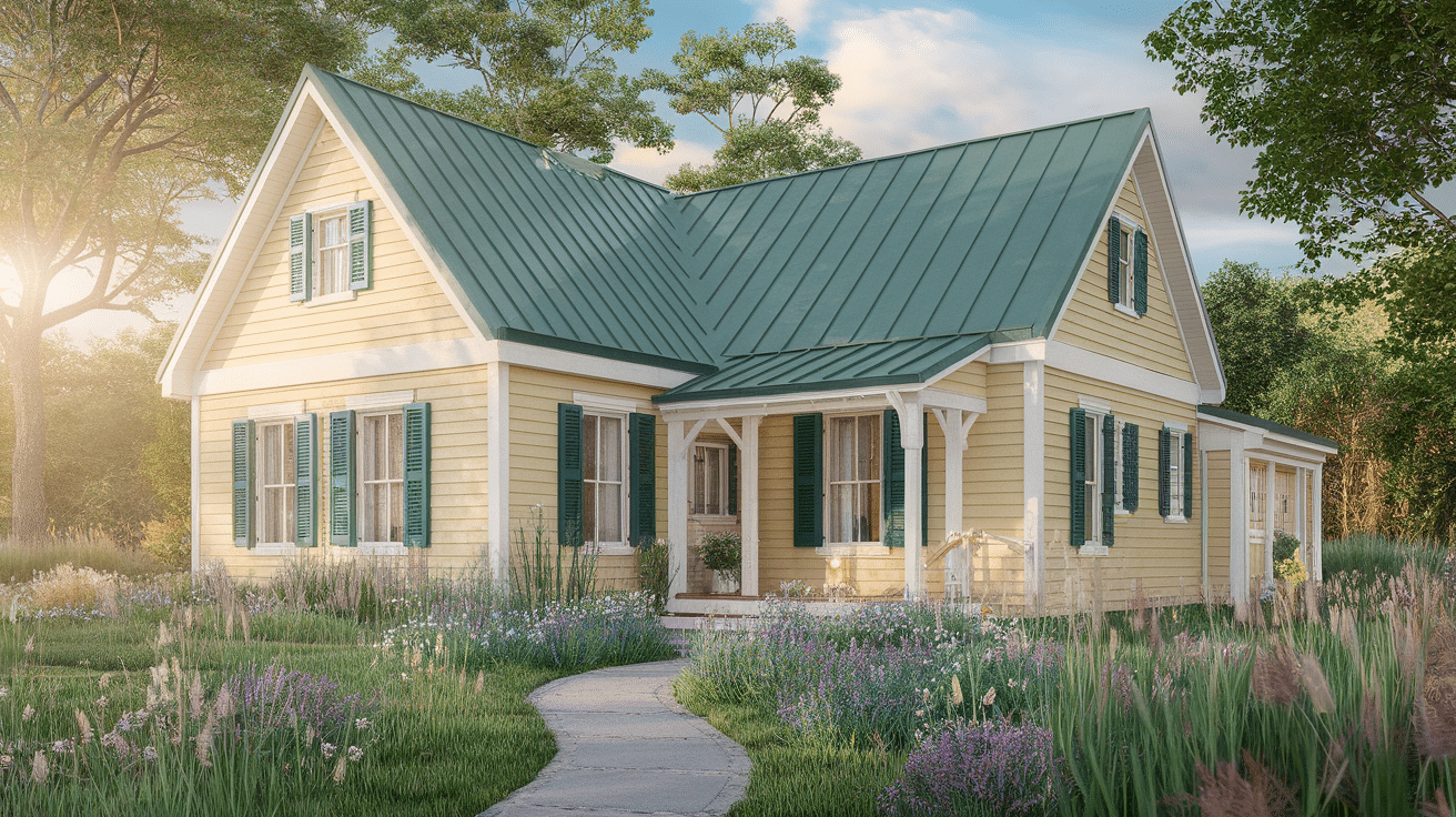 This cheerful pairing is bright and inviting. The green roof adds a natural touch, while the soft yellow siding gives your home a sunny, happy feel. It’s a great choice for family homes or places that get a lot of sunshine. This combo brings warmth and friendliness to any neighborhood.