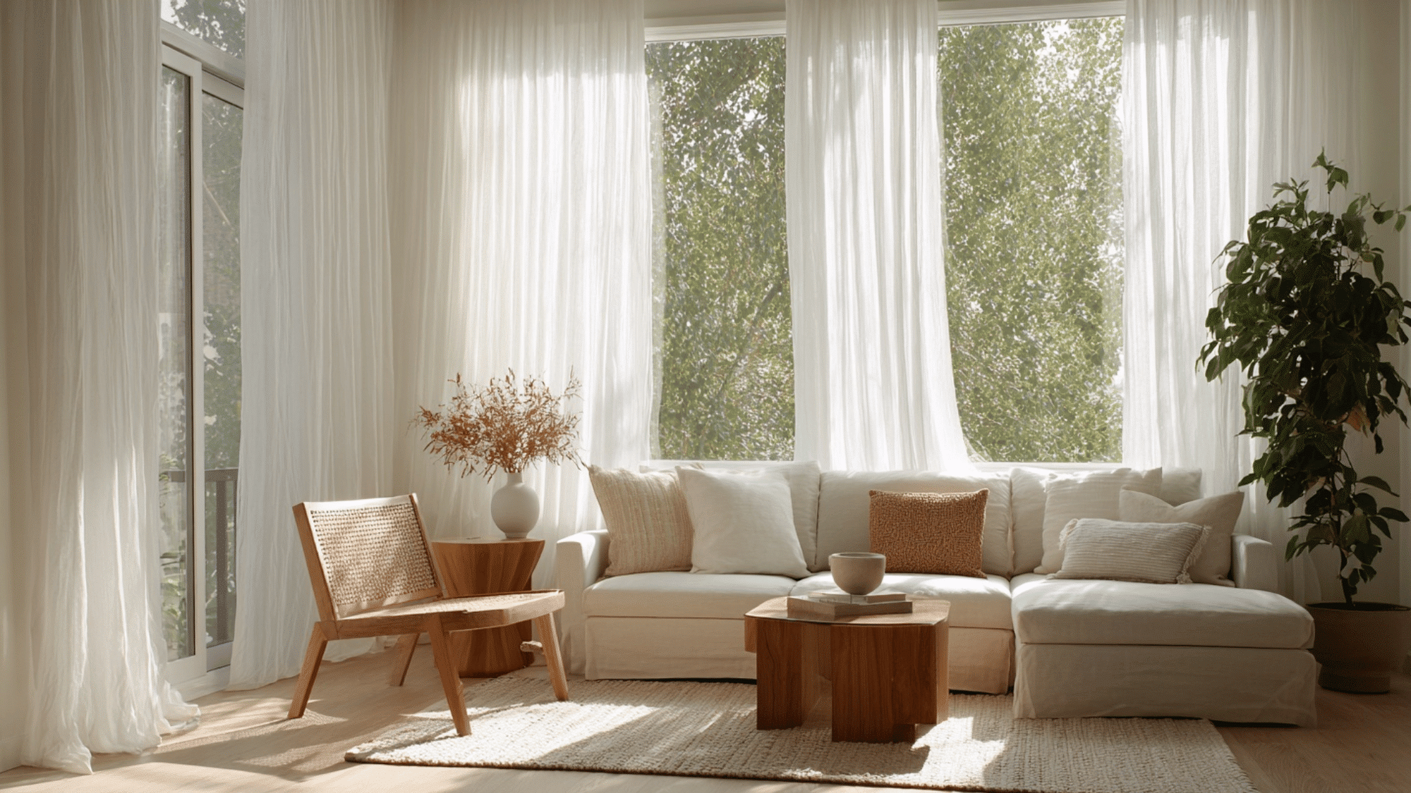 Sheer linen curtains filter natural light beautifully, creating an airy, peaceful atmosphere. Their soft drape adds movement and texture without overwhelming the room.