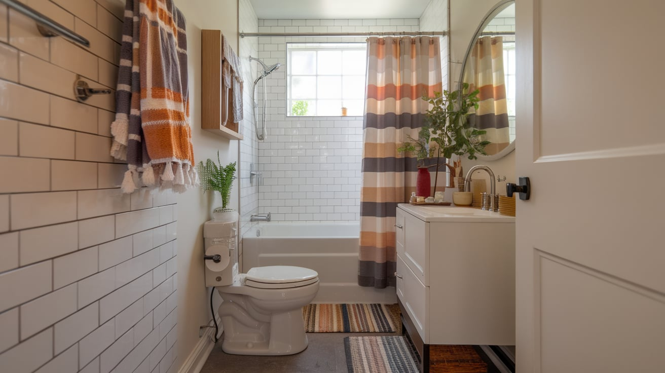 Rugs with stripes, checks, or large prints can make a strong impact in a small bathroom. They help draw attention to specific spots, like the vanity or shower.