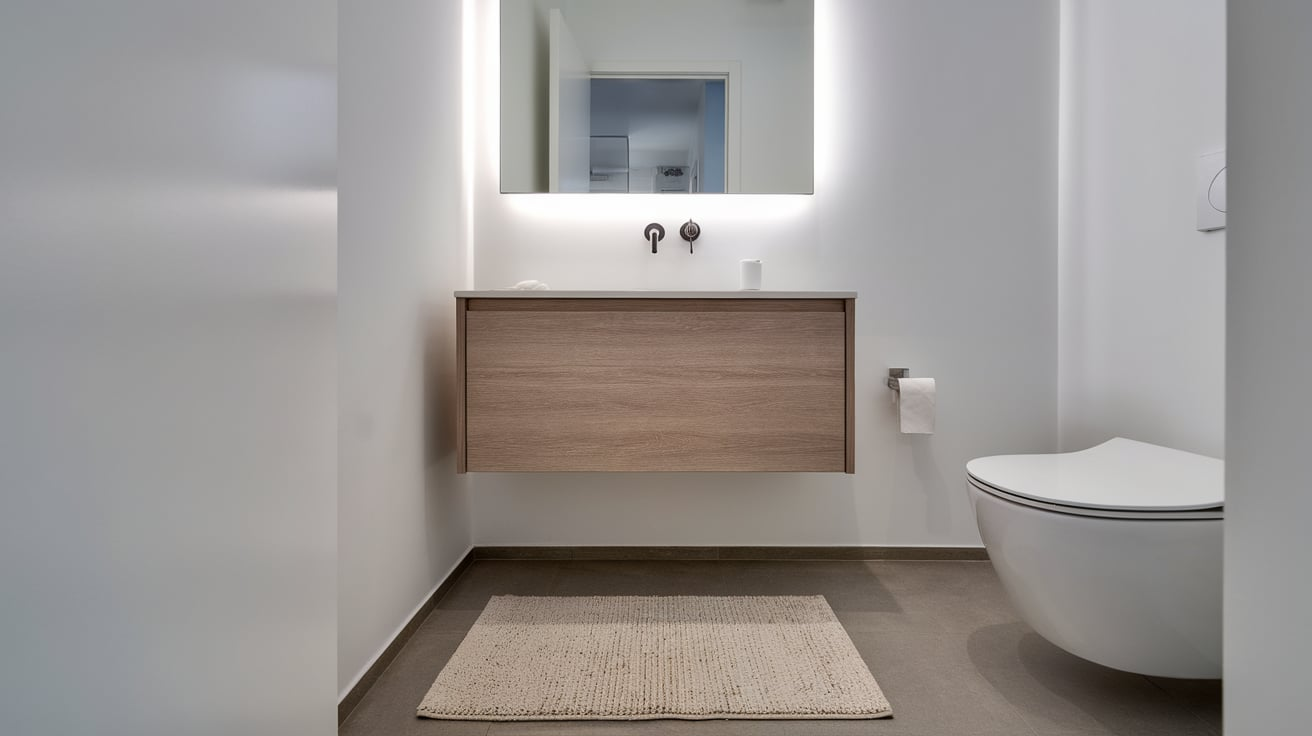 A floating vanity leaves room underneath, and placing a rug there can fill the gap while adding warmth and color. This setup brings balance to the space and can soften the sharp lines of modern fixtures.