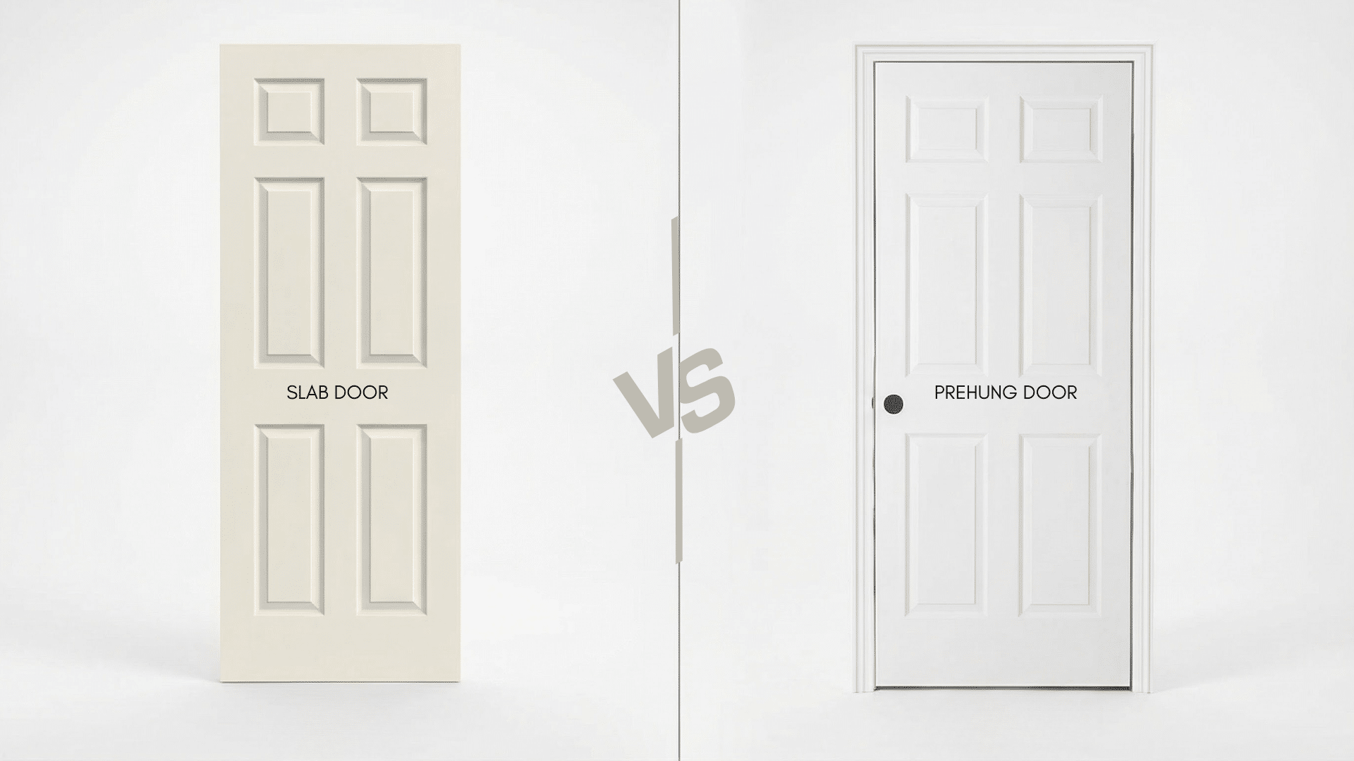Side-by-side comparison of a slab door panel and a prehung door with frame installed with vs written in the middle