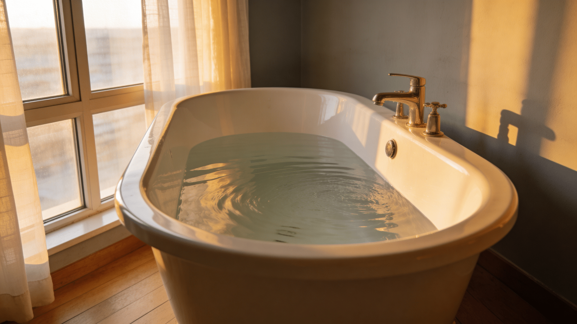 white bathtub filled with water near window sunlight