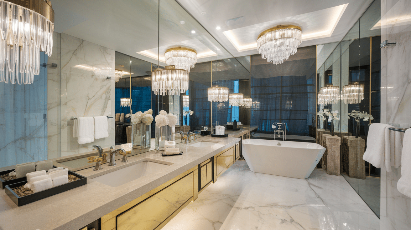 Soft, plush towels and crystal-like lighting complete the elegant feel. Gold or chrome finishes on fixtures bring in extra shine, making the space look chic and polished.