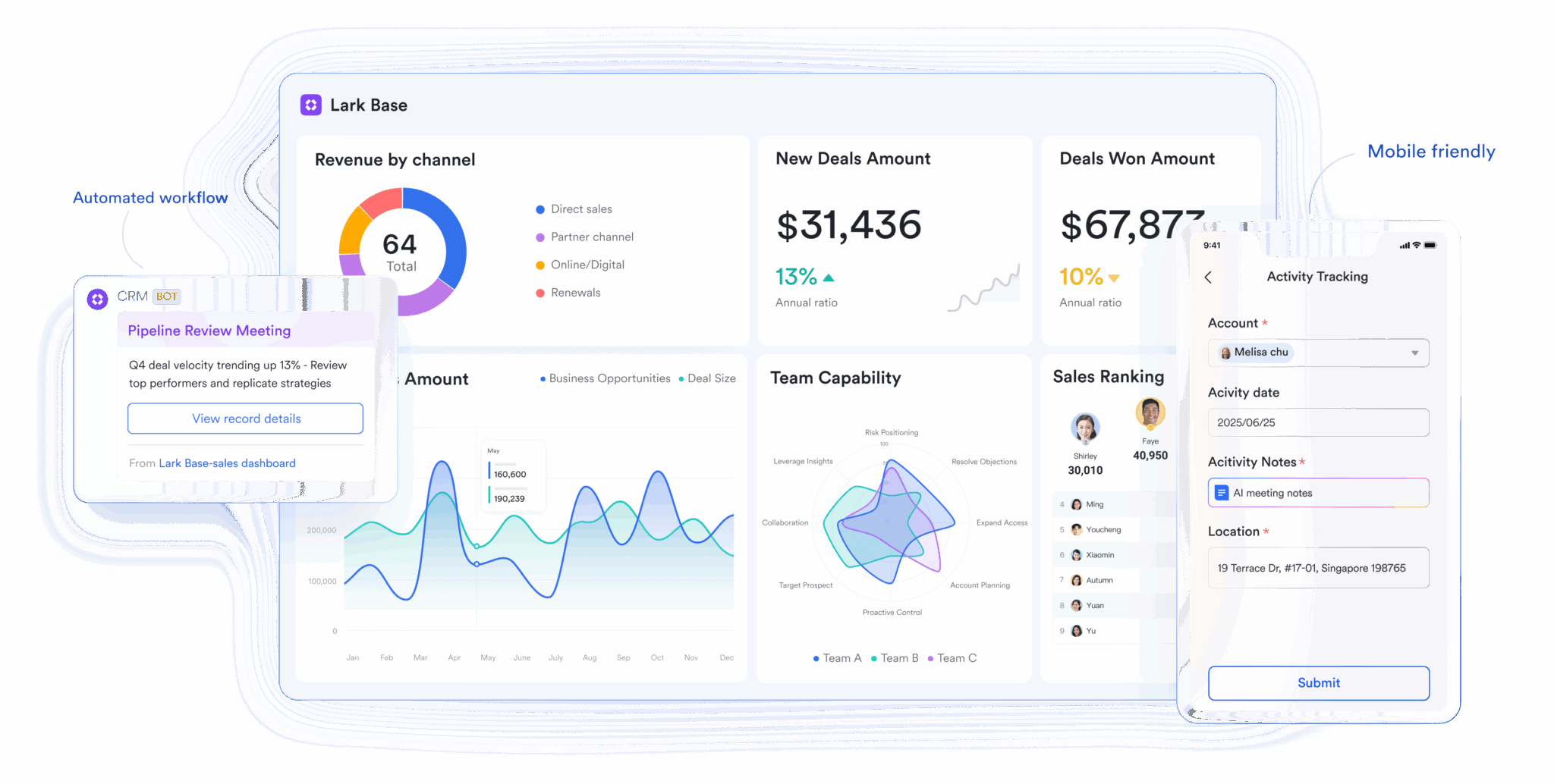 Lark Base is the most essential part of Lark’s ecosystem—a central hub where teams can gather, organize, and analyze operational data. Companies can build customizable databases that connect directly to projects, tasks, and performance metrics, eliminating the need for multiple spreadsheets.