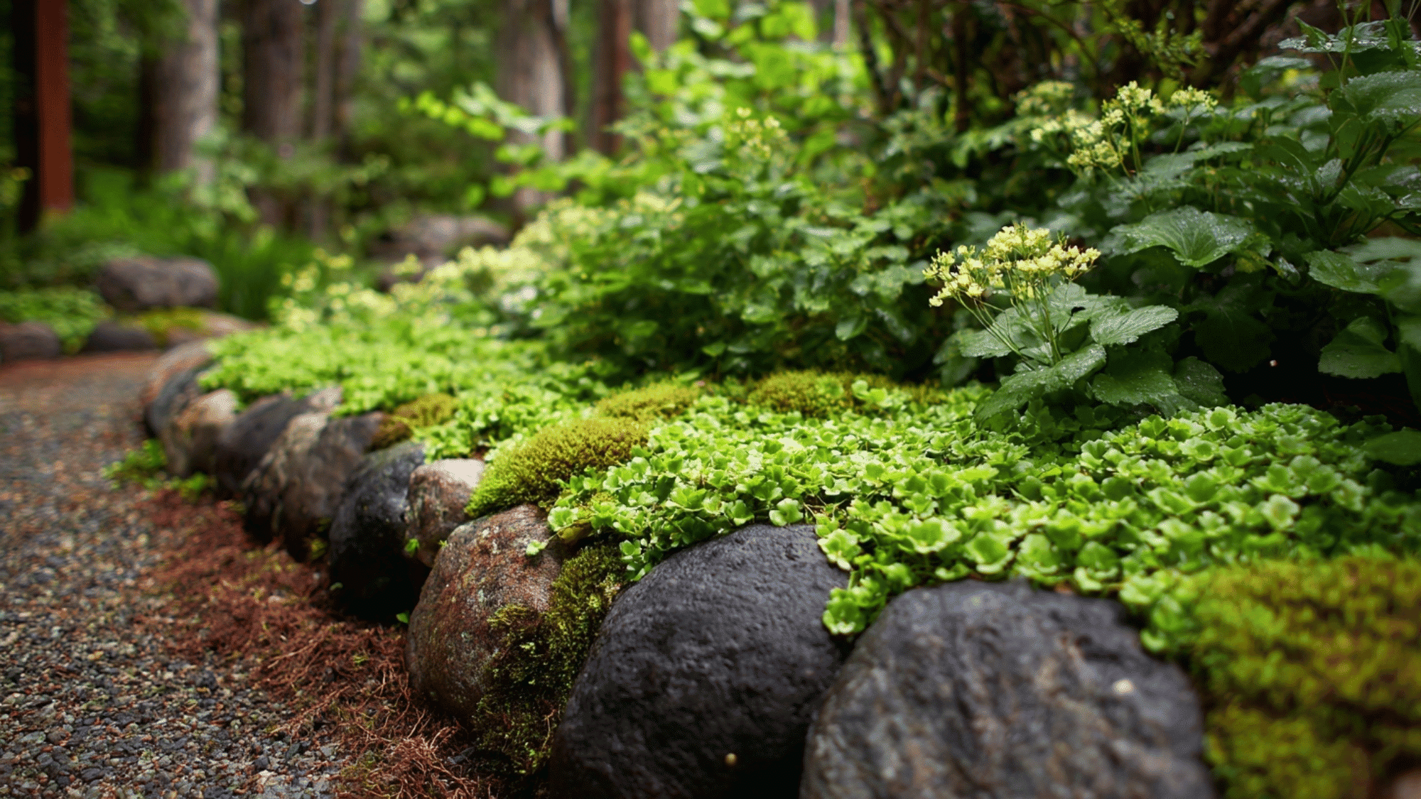 Stones provide structure while plants soften transitions, creating layered borders. This approach mimics forest floors and works beautifully in shaded or natural landscapes.