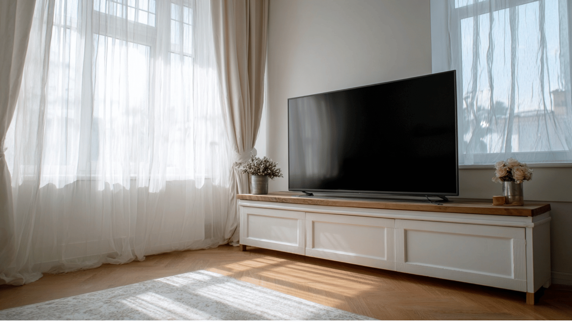 Curtain color matters more than most people think. Shades that complement the TV and surrounding furniture help pull the room together, with neutral tones keeping the focus right where it belongs on the screen.