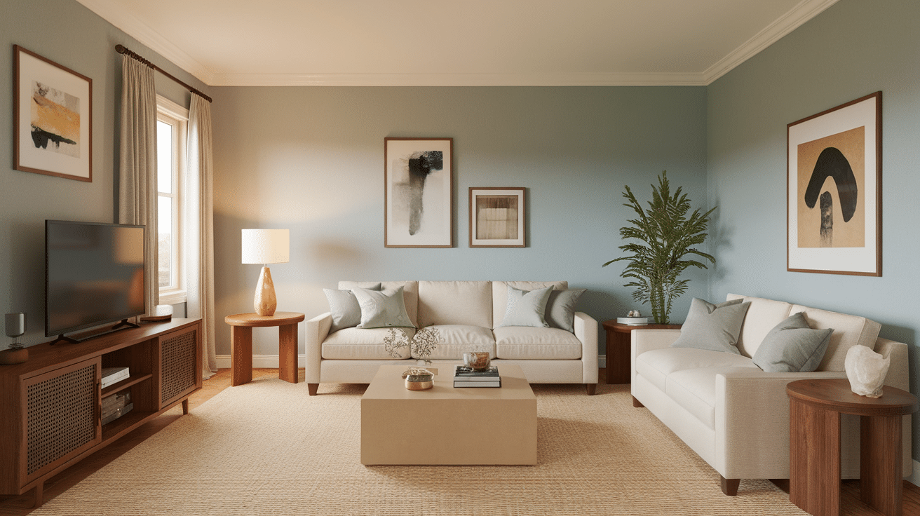 Use wood tables, soft rugs, and metal accents. Keep décor simple but warm.