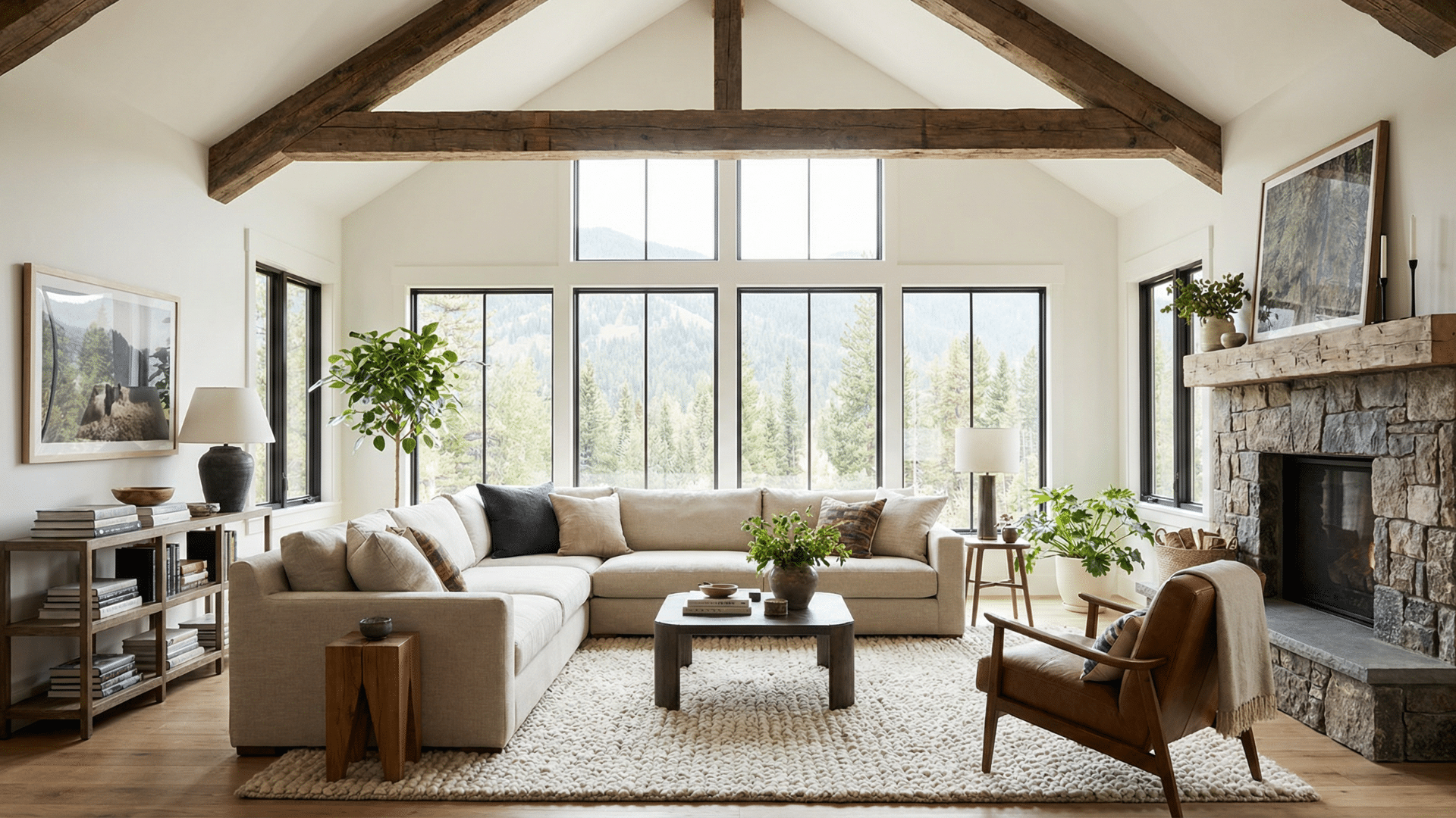 Spacious living room with vaulted ceiling, wooden beams, and large windows letting in lots of natural daylight