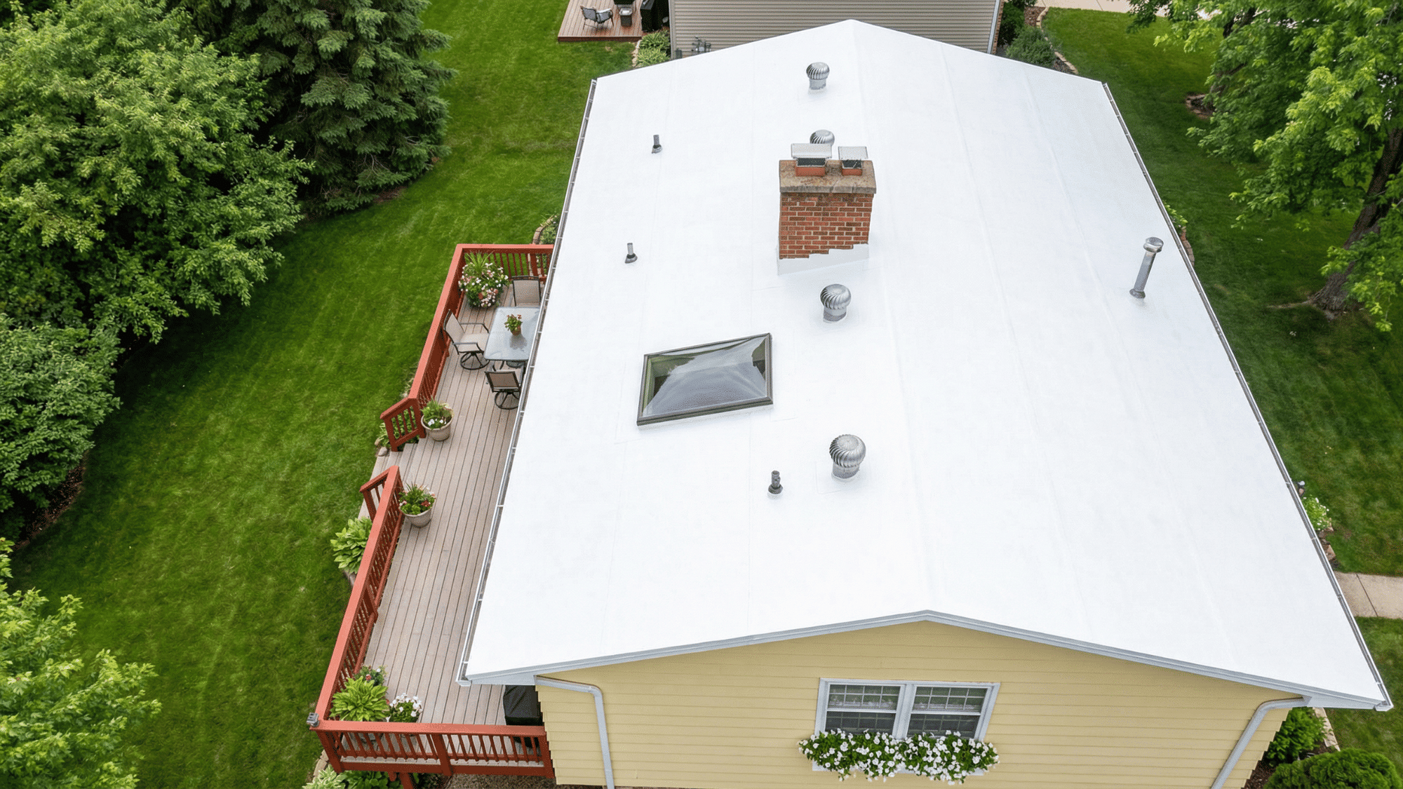 Aerial view of a house with a bright white reflective roof, a brick chimney, a skyligh , and an adjacent wooden deck surrounded by lush green lawn and tree .