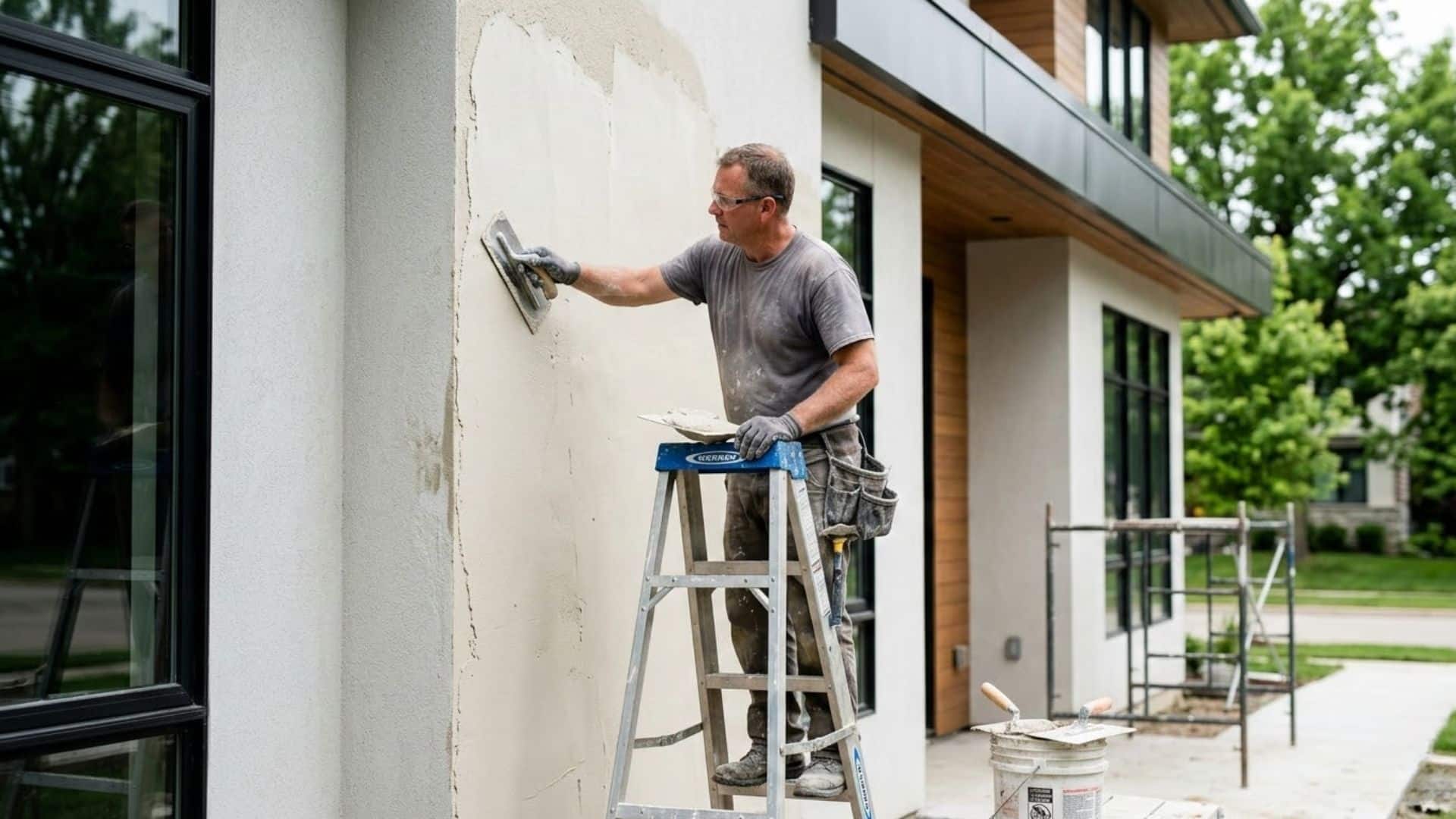 worker applying stucco plaster to exterior wall of a modern home